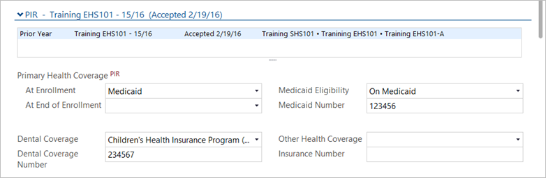 - Complete the Primary Health Coverage At Enrollment, At End of Enrollment, Medicaid Eligibility, Medicaid Number, Dental Coverage, and Dental Coverage Number