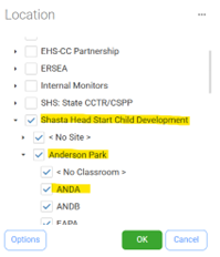 Location: Choose Shasta Head Start Child Development, click the arrow then select your center, click the center arrow and select your classroom