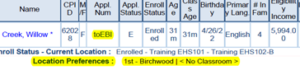 The highlighted sections below indicate that the child in the example is enrolled and waiting to transfer to Birchwood.